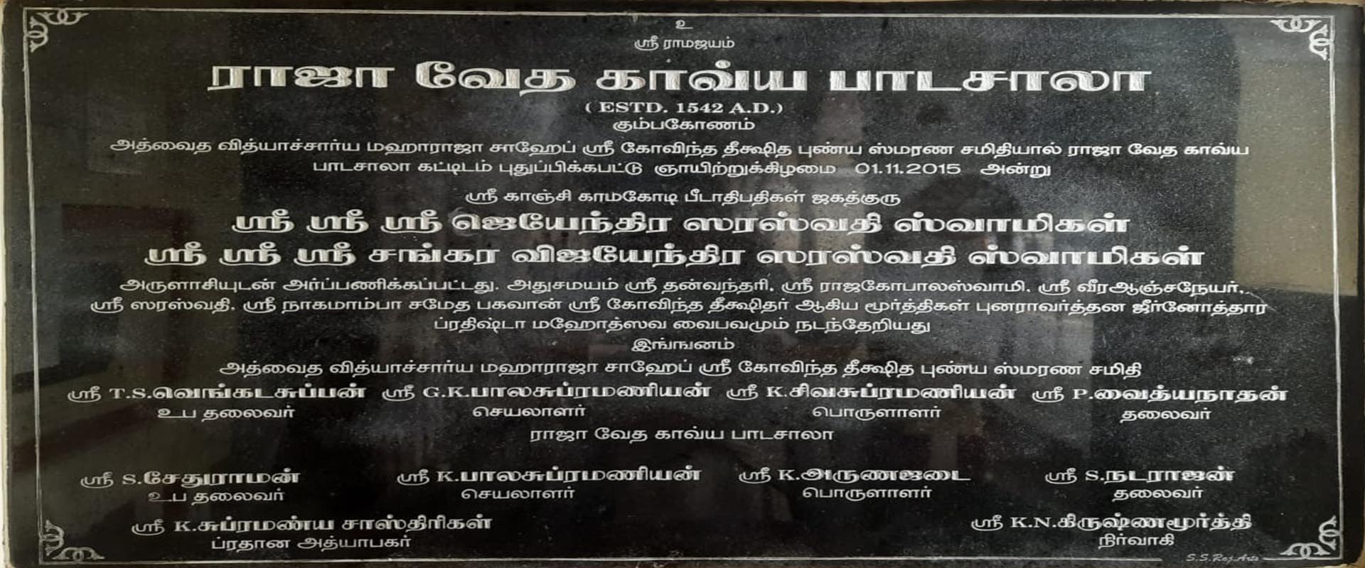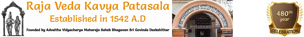 Raja Veda Patasala was founded in the year 1542 A.D. by Illustrious Statesman and Chief Minister for 3 Nayak kings of Thanjavur - Advaitha Vidyacharya Maharaja Saheb Sri Govinda Deekshithar. It was a well known center of higher learning of Vedas and allied subjects, but owing to the vagaries of time it slowly declined in eminence.
